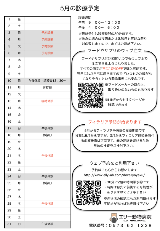 5月の診療予定を追加しました。