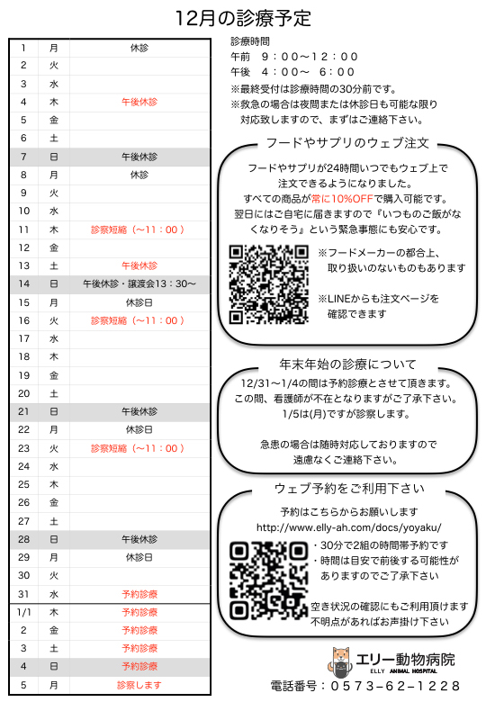 12月の診療予定を追加しました。