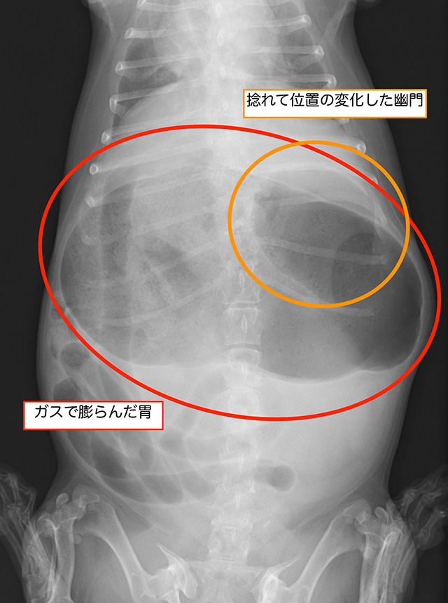 急にお腹が張ってきた、お腹を痛がる、吐きたそうだが吐けない、涎が出る、呼吸がしづらそう、など時間とともに病態は急速に悪化し、循環は低下して粘膜色は蒼白となり、虚脱し、命に関わります。