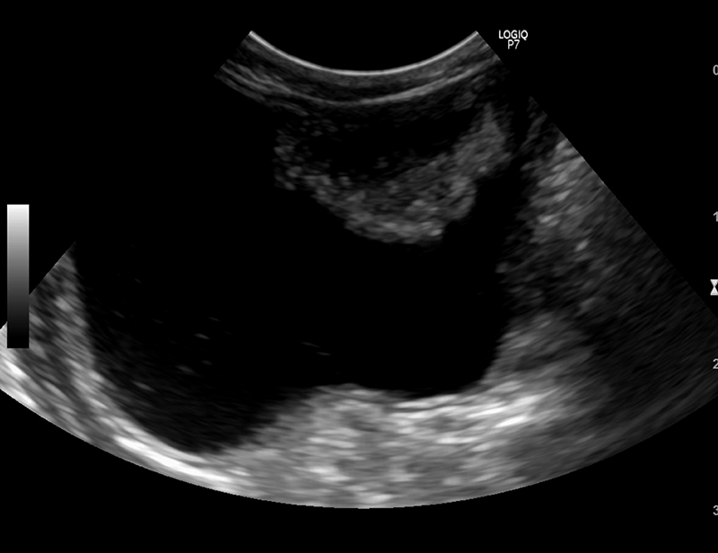 膀胱の中に明確な腫瘤が発見できることが多く、腫瘤の発生している部位、膀胱壁や尿管・尿道への浸潤具合、さら